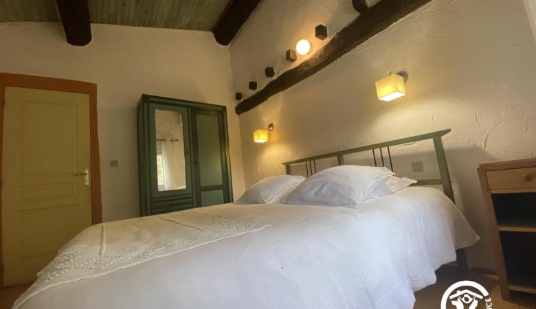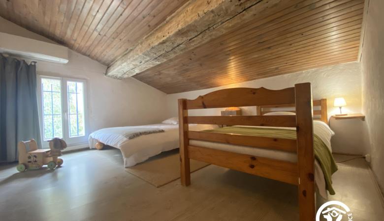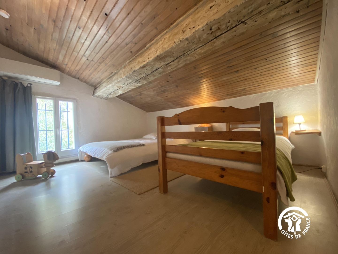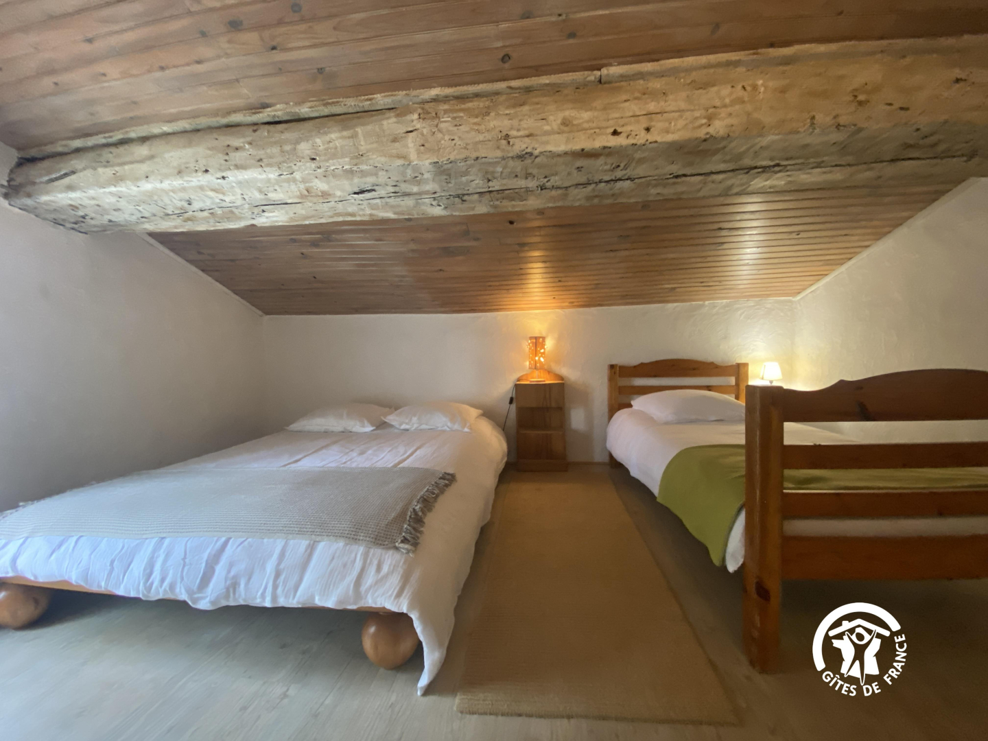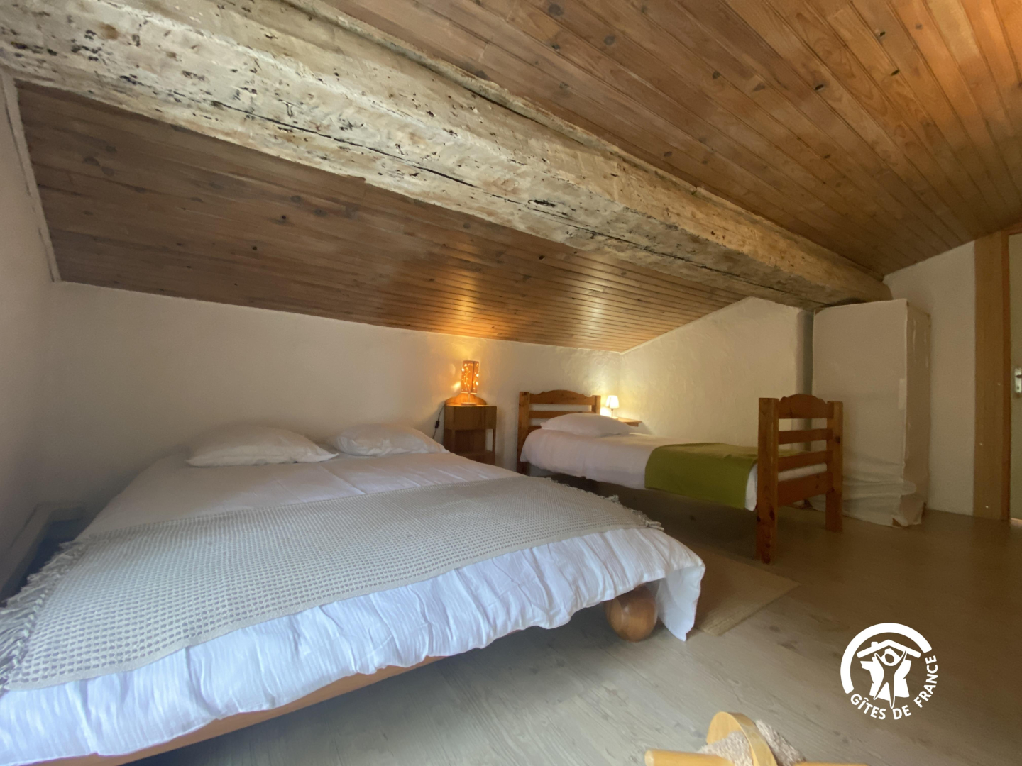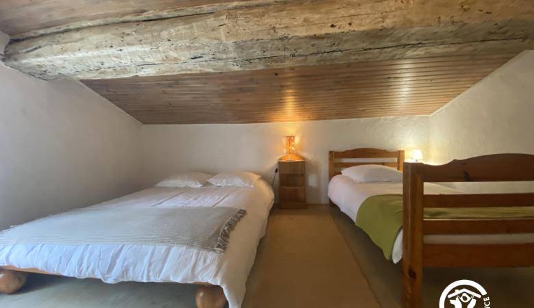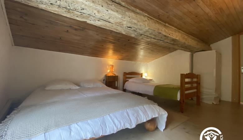 En el segundo nivel, un dormitorio abuhardillado se ha convertido bajo el techo con una cama doble y una cama individual.
