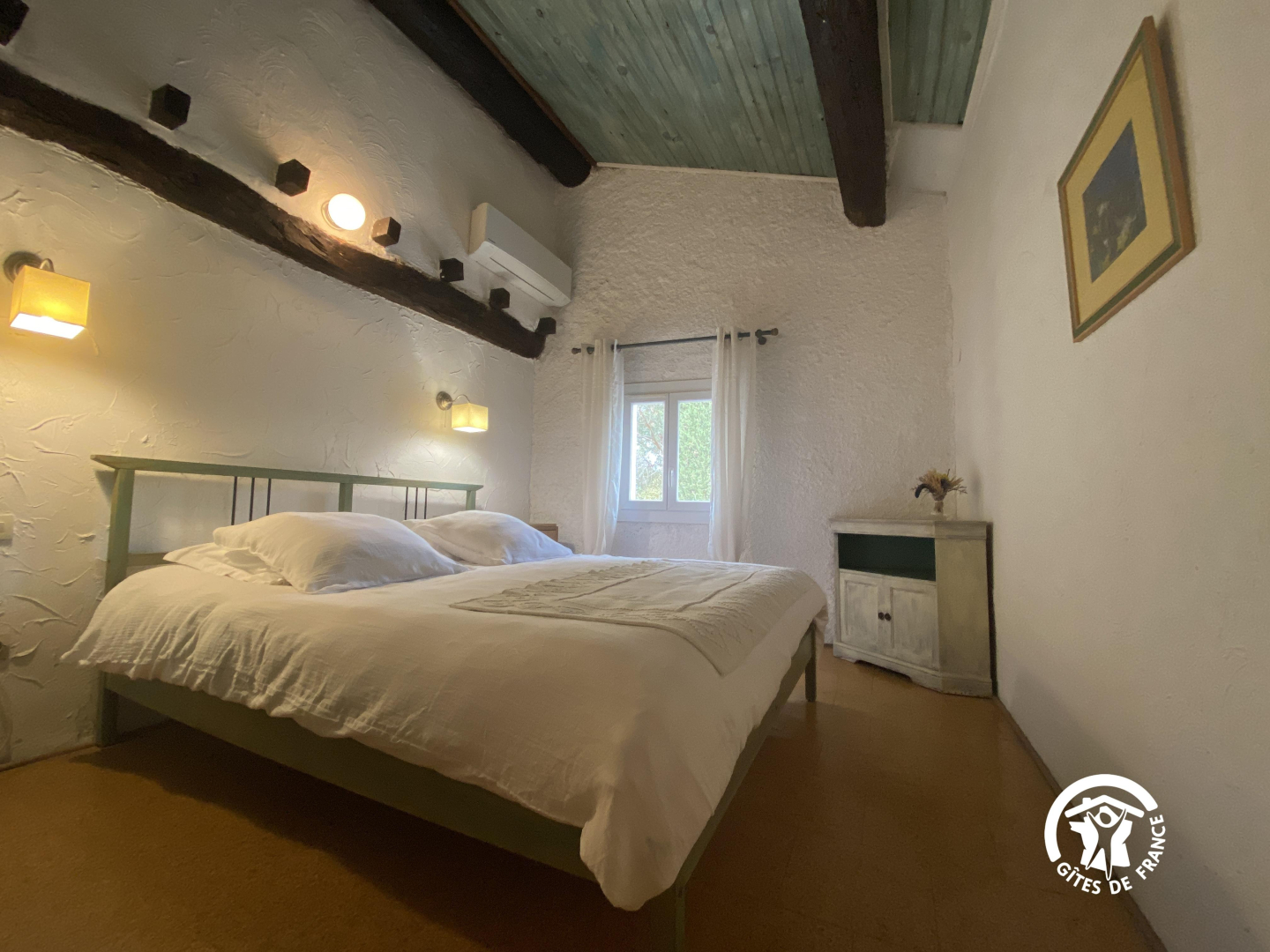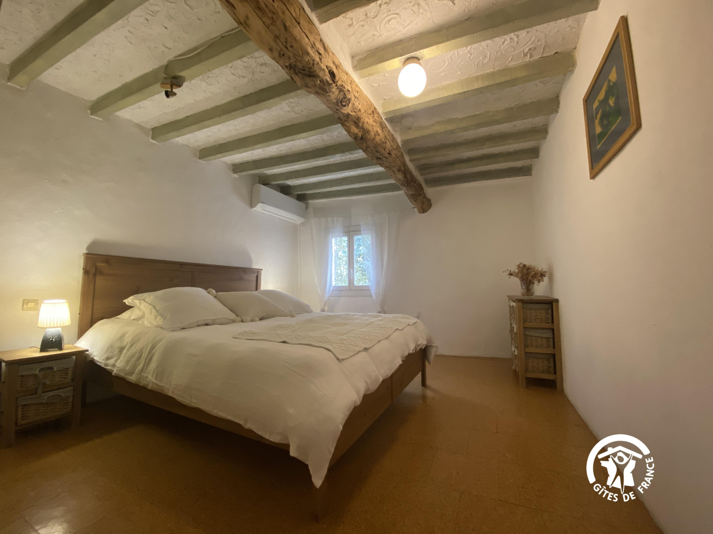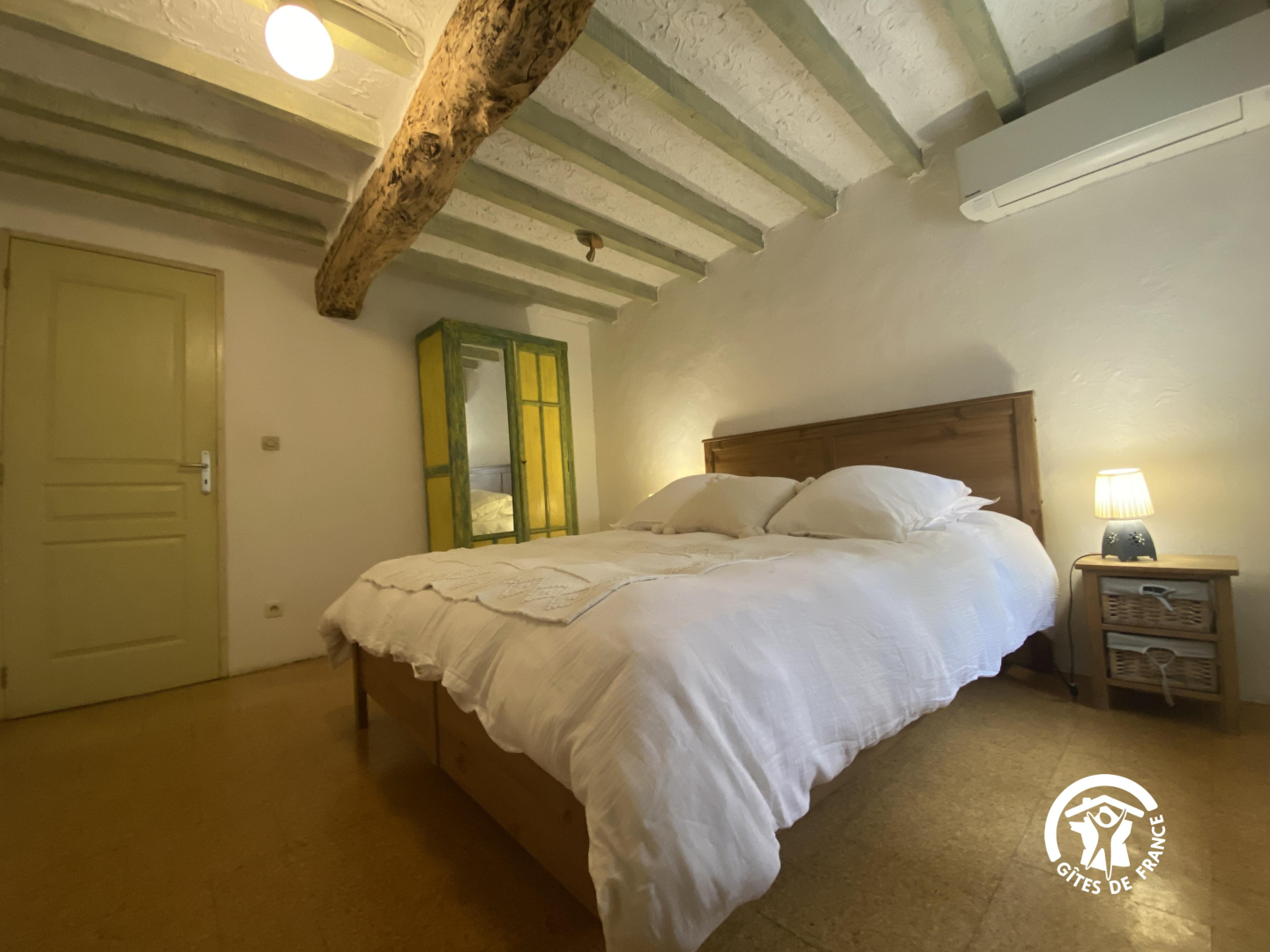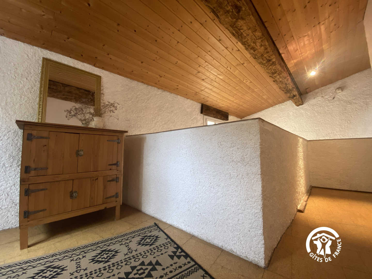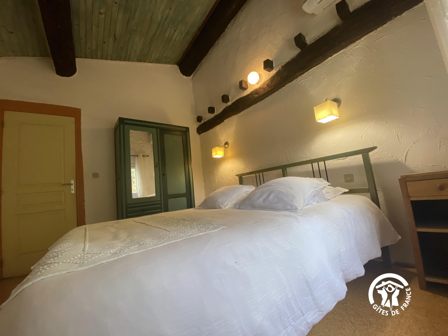 En el segundo nivel, un dormitorio abuhardillado se ha convertido bajo el techo con una cama doble y una cama individual.